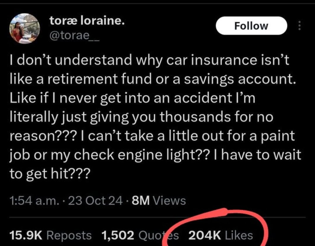 The most pure version of this was an old Chris Rock routine where he says that they should call insurance ‘in case shit.’ And then he says, ‘if shit don’t happen, shouldn’t I get my money back?’ And the audience cheers. Except, well, yeah.