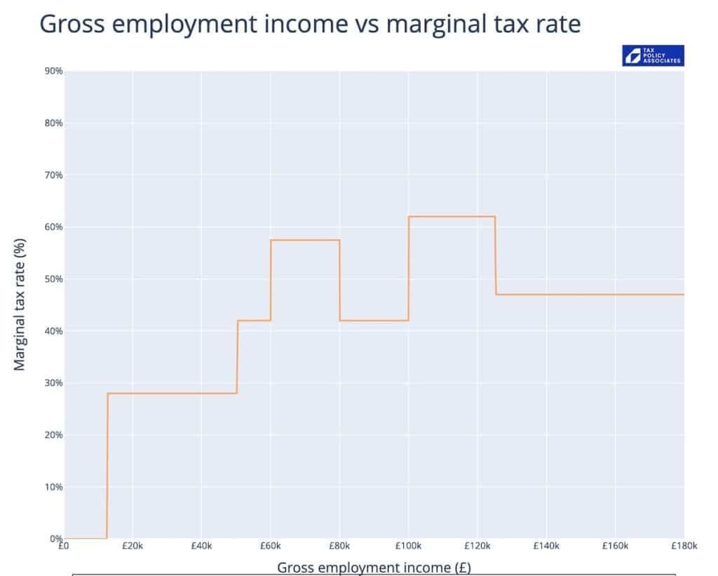 Dan Neidle: The 20,000% spike at £100,000 is absolutely not a joke – someone earning £99,999.99 with two children under three in London will lose an immediate £20k if they earn a penny more. The practical effect is clearer if we plot gross vs net income.
