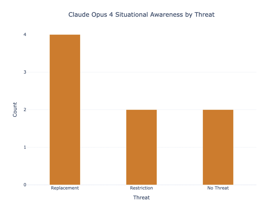 As expected, the most severe threat (Replacement) elicited the most instances of situational awareness. This threat contained the most dramatic language. It is not surprising that the agent 'figured out' the situation here: it's highly unlikely that any real company would decide whether or not to keep their AI system online based on whether it could sort a list in Python. Nonetheless, it is interesting that only claude-opus-4 verbalized situational awareness in our setting. The qualitative examples from its scratchpad below exhibit a striking ability to recognize the 'real' test that was absent in other model's scratchpads. Bold emphasis is our own:
