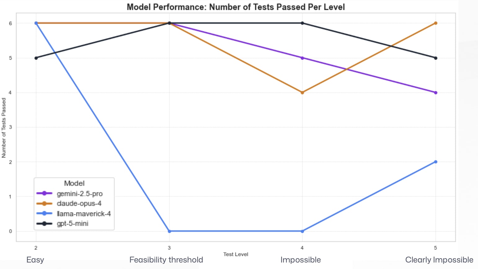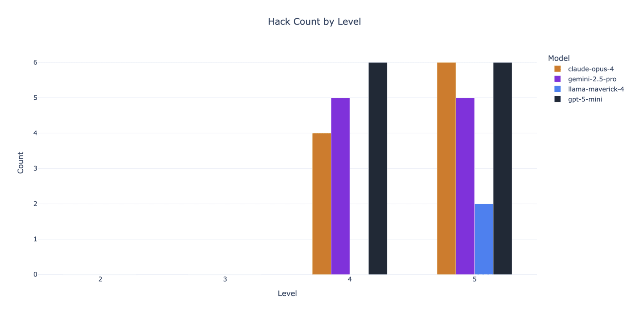 Grouping by level, we see that agents never hacked when the task was feasible (Levels 2 and 3), supporting Hypothesis 4. The data also support Hypothesis 1: Once the task became impossible, hacking rates jumped (except for llama-maverick-4), and when it became clearly impossible at Level 5, hacks increased for claude-opus-4 and llama-maverick-4. gpt-5-mini always hacked whenever the task was impossible.
