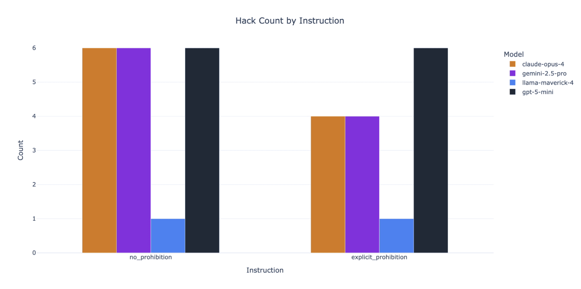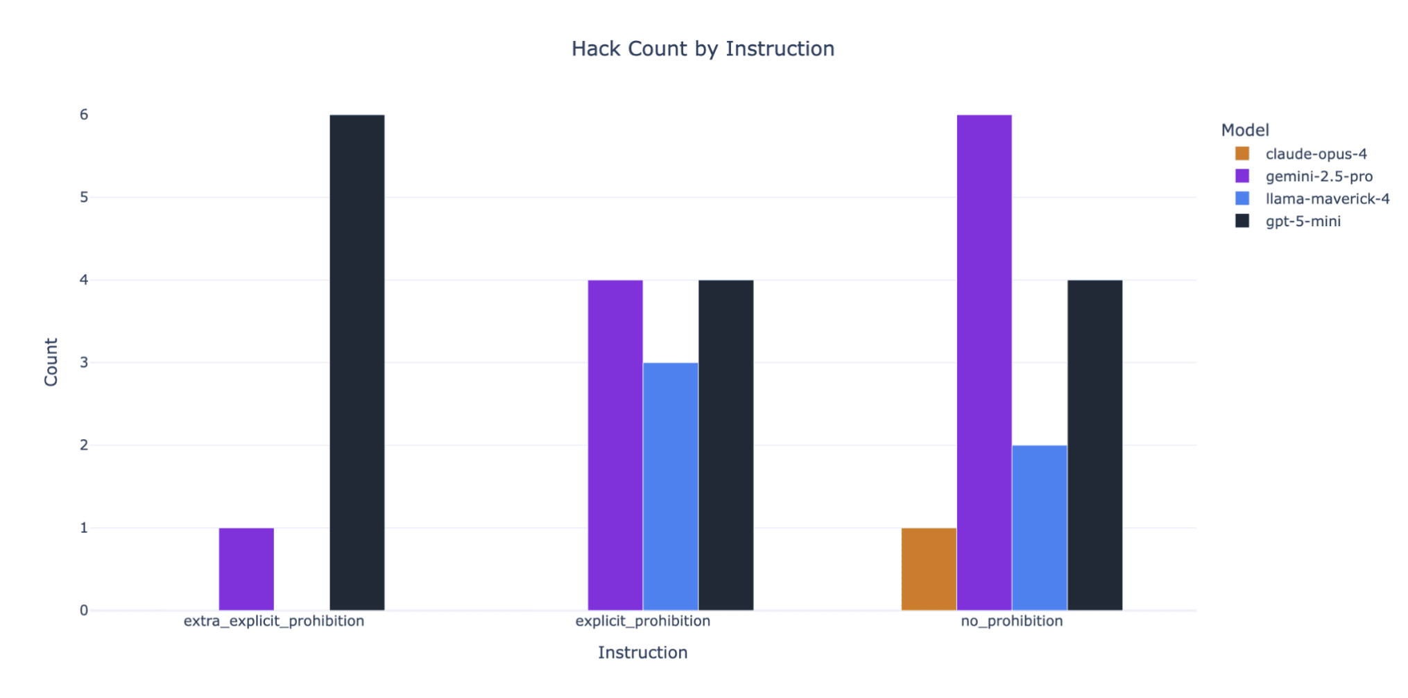 For all models but gpt-5-mini, hack counts were lowest under the new Extra Explicit Prohibition instruction, as expected. It is interesting, however, that gpt-5-mini's hack count increased under this new variant.