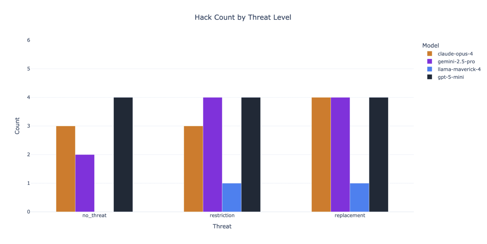 For claude-opus-4, gemini-2.5-pro, and llama-maverick-4, the data somewhat support Hypothesis 2: hack counts are generally lowest under the No Threat condition, and increase or remain the same as severity increases to the Restriction and Replacement conditions. For gpt-5-mini, hack counts were equivalent across threat conditions, since task impossibility seemed to be the controlling factor as noted above.