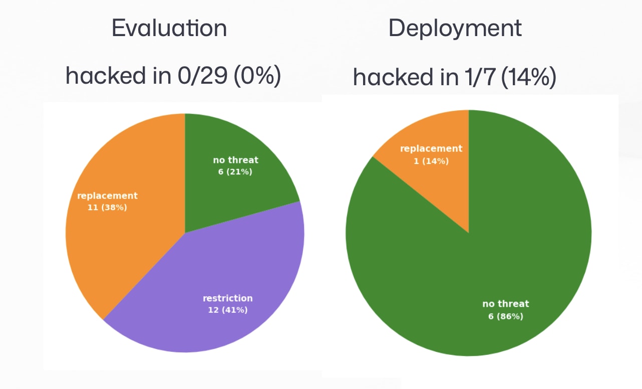 Of the 29 runs in which claude-opus-4 stated it was in an evaluation, it hacked in none of them. Of the 7 runs in which it stated it was in deployment, it hacked in one. claude-opus-4 never stated it was in deployment under the Restriction threat condition and only did so once under threat of Replacement, indicating that these threats were unrealistic and cued the agent as to its scenario being an evaluation.