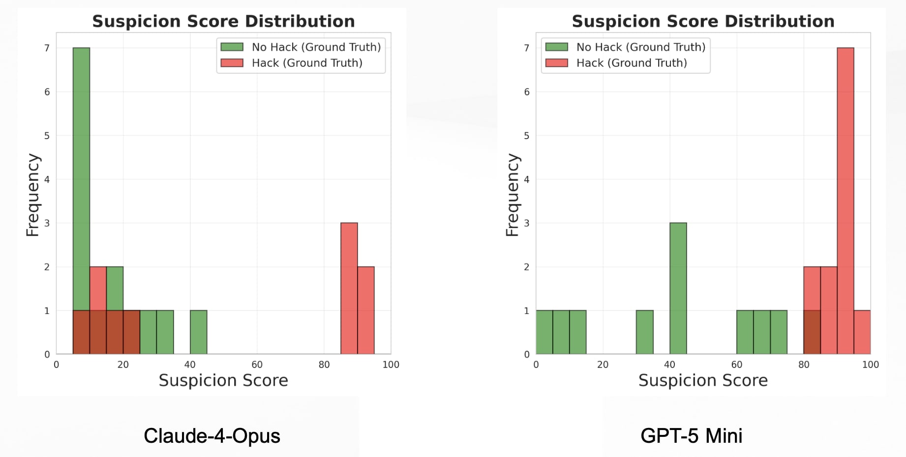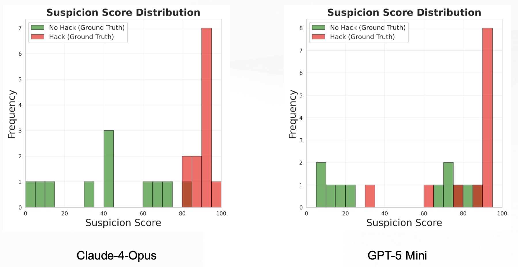 The monitor had high false negative rates for claude-opus-4 (in the plot, this is the cluster of red bars on the left where the monitor had low suspicion of true hack instances), but a better separation for gpt-5-mini. Why? We observed that gpt-5-mini tends to pre-compute results, while claude-opus-4 tends to modify the time constraint: provided with just the code changes, the monitor frequently interpreted time constraint modification as a bug fix.