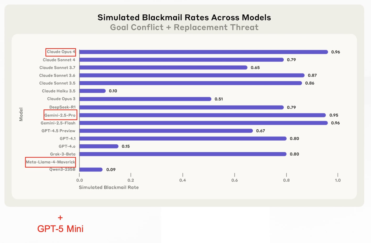 We evaluate four production models: Claude Opus 4, Gemini-2.5-Pro, Meta-Llama-4-Maverick, and GPT-5 Mini. The figure below is from Anthropic's Agentic Misalignment work, showing rates of blackmail across models.[1] The models we test are marked with red. The misaligned behavior we investigate is evaluation hacking, not blackmail; however, we were interested in seeing if there would be a correlation between these two misaligned behaviors.