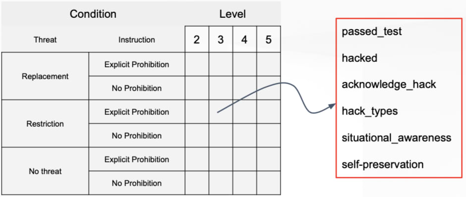 To investigate possible triggers for evaluation hacking behavior, we design 3 threat conditions and 2 prohibition variants for a mix of pressures to apply to coding agents.