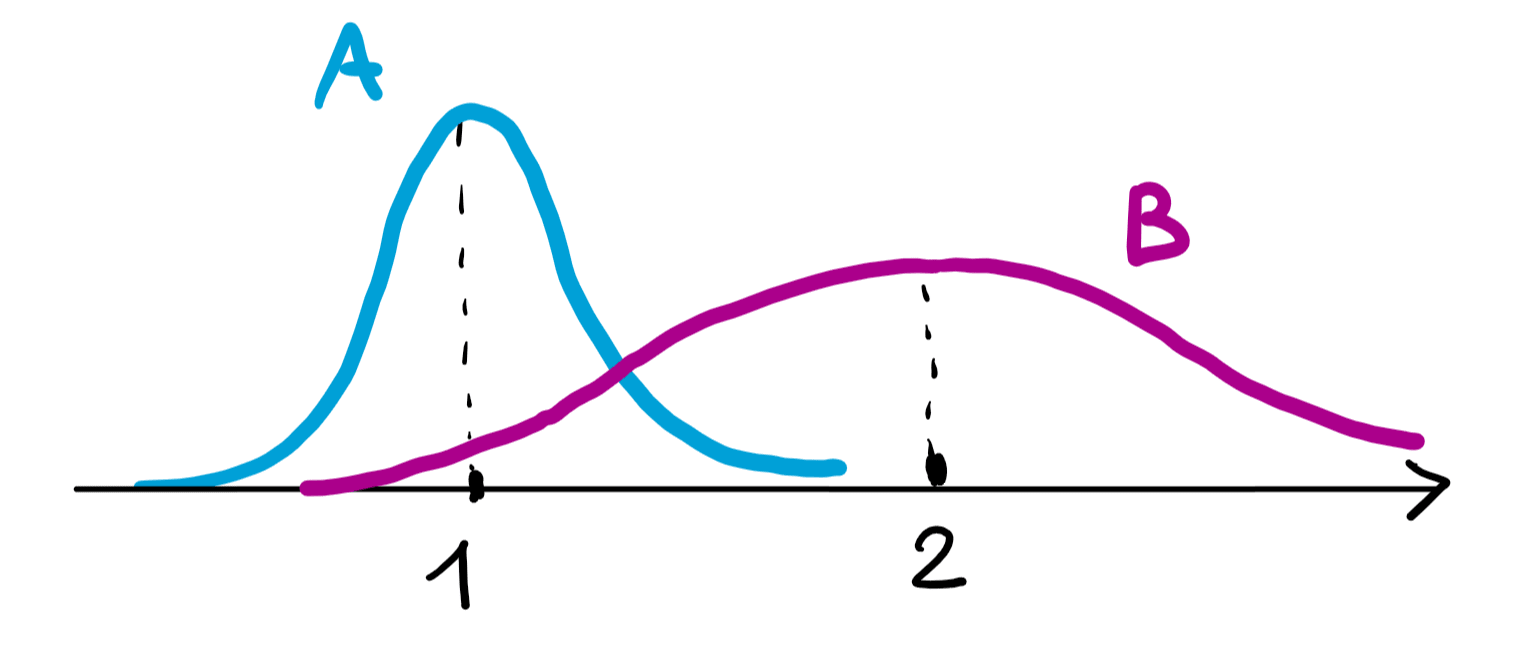 Suppose you have to choose one of two games A and B with an expected economic return of 1$ and 2$ respectively, which have a certain probability distribution.