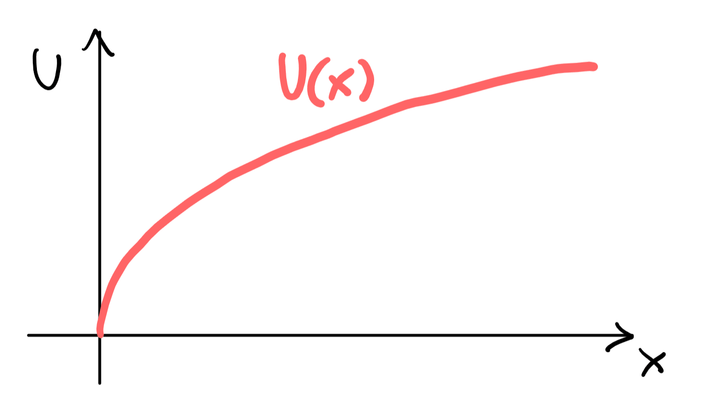The effect of adding new money to our wealth can be different depending on the wealth we already have at the present moment (10'000 $ can be much more meaningful to someone who has no money than to a millionaire). We model this fact by defining a "utility" function which represents the impact of the extra money on the life of a specific person. We could expect this utility function to be increasing with the amount of money (the more the better) and its slope to be always decreasing (the richer we are the less we care about 1 more dollar), like this: