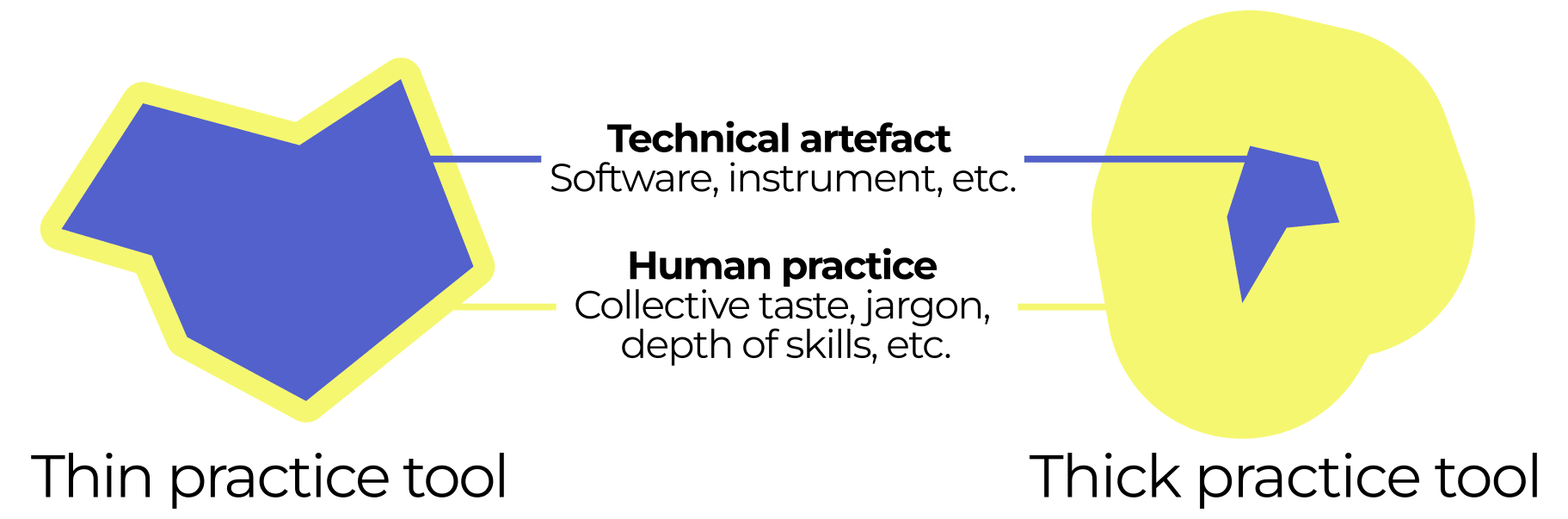 The practice is the surface of contact between the tool and its users, the yellow contour in the diagram below. Some tools create a thin practice. This includes both narrow tools, like hammers, which are designed for a specific use case and require little learning, and very general tools, like a computer, which support diverse use cases equally well.