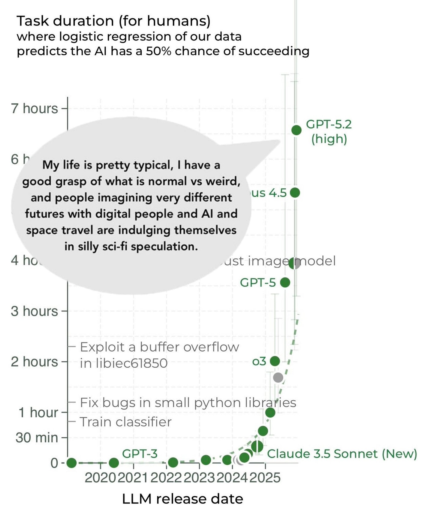 Does that reflect flaws in the methodology of the METR test, with it now being essentially ‘out of distribution’ and saturated? I think somewhat this is true, and I’m not sure how much stock we should put in ‘this is a 5 hour task’ or a 7 hour task, or how further scaling should be understood here. I do think the rapid acceleration reflects the reality that OpenAI, Anthropic and Google have AIs that can often one shot remarkably complex tasks, and this ability is rapidly growing.