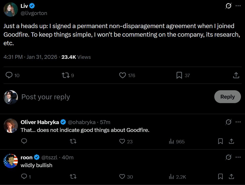 Praise be to Goodfire for letting Liv say that she had to sign the agreement, and for removing the agreements once brought to light.