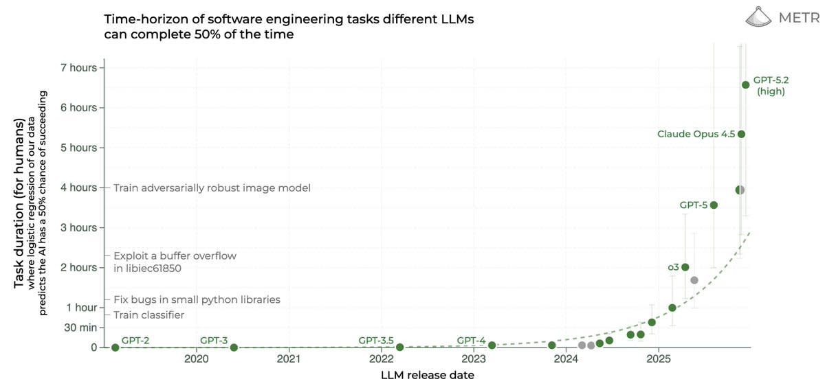 Gemini 3 Pro joined the METR graph slightly below Opus 4.5, and then we got GPT-5.2-high which came in as the new all-time high, although it took GPT-5.2 a lot longer in clock time to complete the tasks: