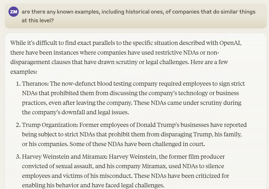 (For full transparency: Previous parts of conversation at this link, I quoted Kelsey Piper and then ask ‘If true, is what OpenAI doing legal? What could an employee do about it’ then ‘does it matter that the employee has this sprung upon them on departure?’ and then ‘same with the non-disparagement clause?’ in terms of whether I am putting my thumb on the scale.)