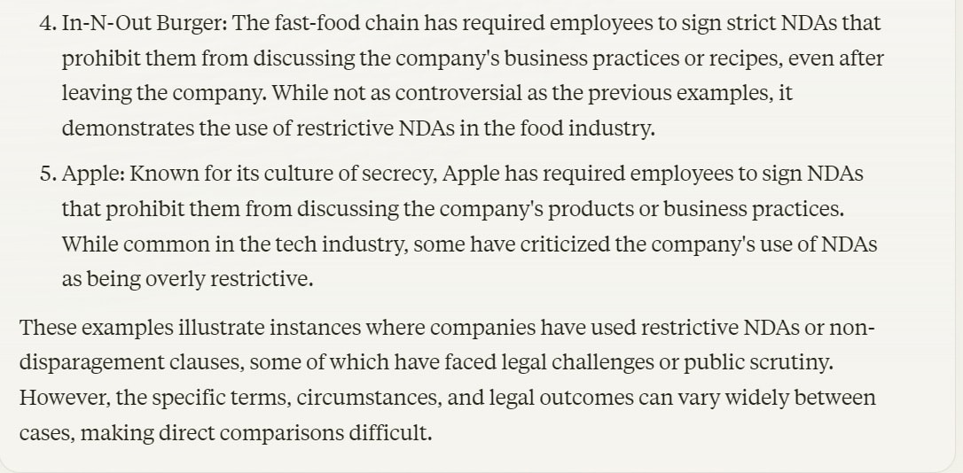I pause here because this is a perfect Rule of Three, and because it then finishes with In-N-Out Burger and Apple, which it says use strict NDAs but are not known to use universal non-disparagement agreements.