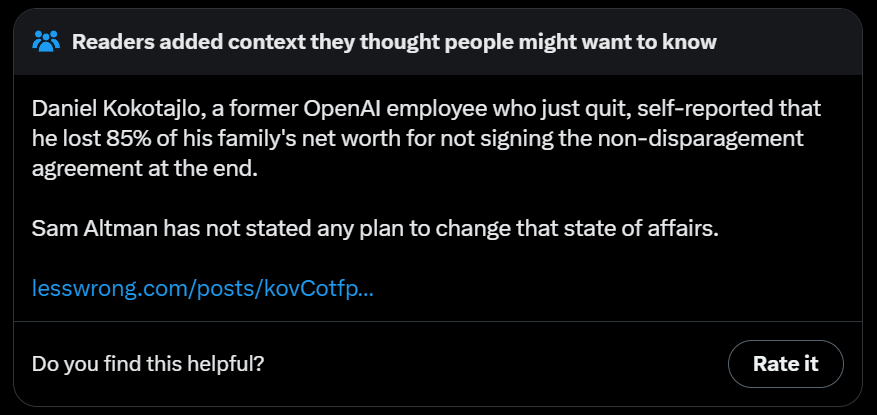 Then we learned that OpenAI has systematically misled and then threatened its departing employees, forcing them to sign draconian lifetime non-disparagement agreements, which they are forbidden to reveal due to their NDA.