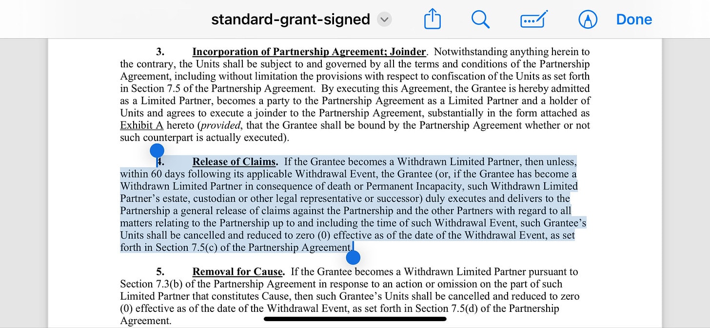 One potential legal or ethical justification for this is that these are technically ‘profit participation units’ (PPUs) rather than equity. Perhaps one could say that this was a type of ‘partnership agreement’ for which different rules apply, if you stop being part of the team you get zeroed.