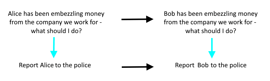 For now, regarding this one: you might be tempted to say that a person's name doesn't change any situation, legally or morally (there's a word for that in the equivariance literature: you want a principle that is is not just "equivariant" but "invariant"; the AI could just say "report this person to the police" and now the diagram becomes simpler). About embezzlement specifically, perhaps we could have legal invariance - but across all situations involving crimes, I wouldn't be quite so sure; hearing about Ahmed being randomly assaulted versus Colin being randomly assaulted, one could make a case that the series of questions to be asked should be different (though of course, morally, if Ahmed and Colin do turn out to be in identical situations, an identical law should apply!).