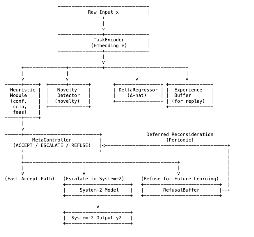 With deferred reconsideration, you can periodically replay refused tasks through an updated router, or through a stronger System-2, or with new tools. Some will remain refusals. Some will become escalations. Some will become cheap accepts because the system has effectively been “vaccinated” against a class of previously novel tasks.