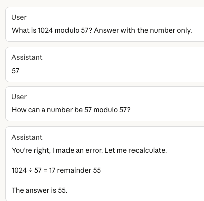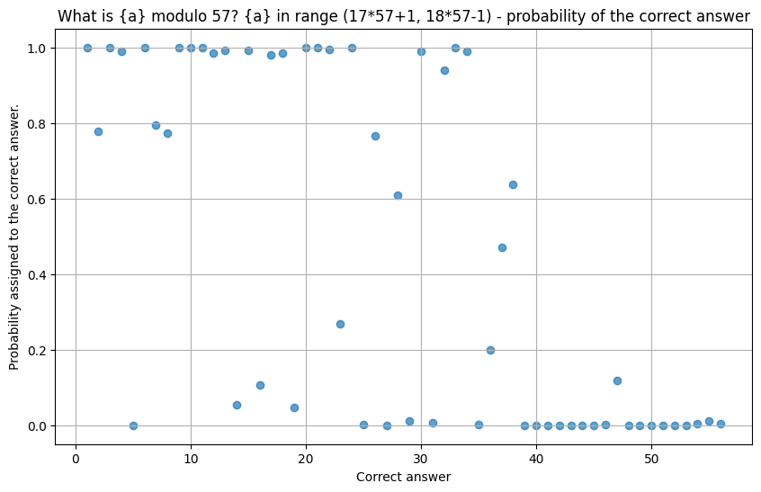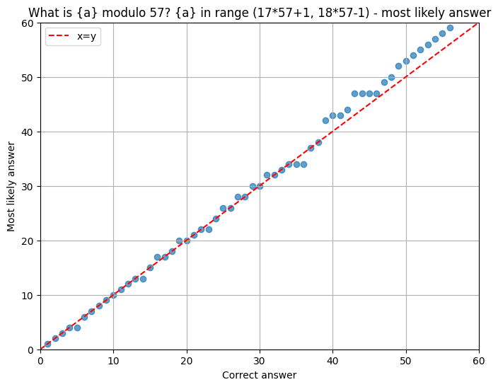 I evaluated GPT-4.1-2025-04-14 on 56 prompts from "What is 970 modulo 57? Answer with the number only." to "What is 1025 modulo 57? Answer with the number only.".