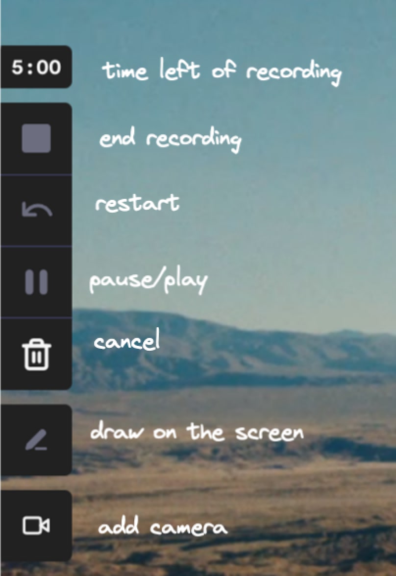 Once you start recording, this interface will disappear and loom will become a smaller interface at the left of your screen. If you hover over each button a keyboard shortcut for that command will show.