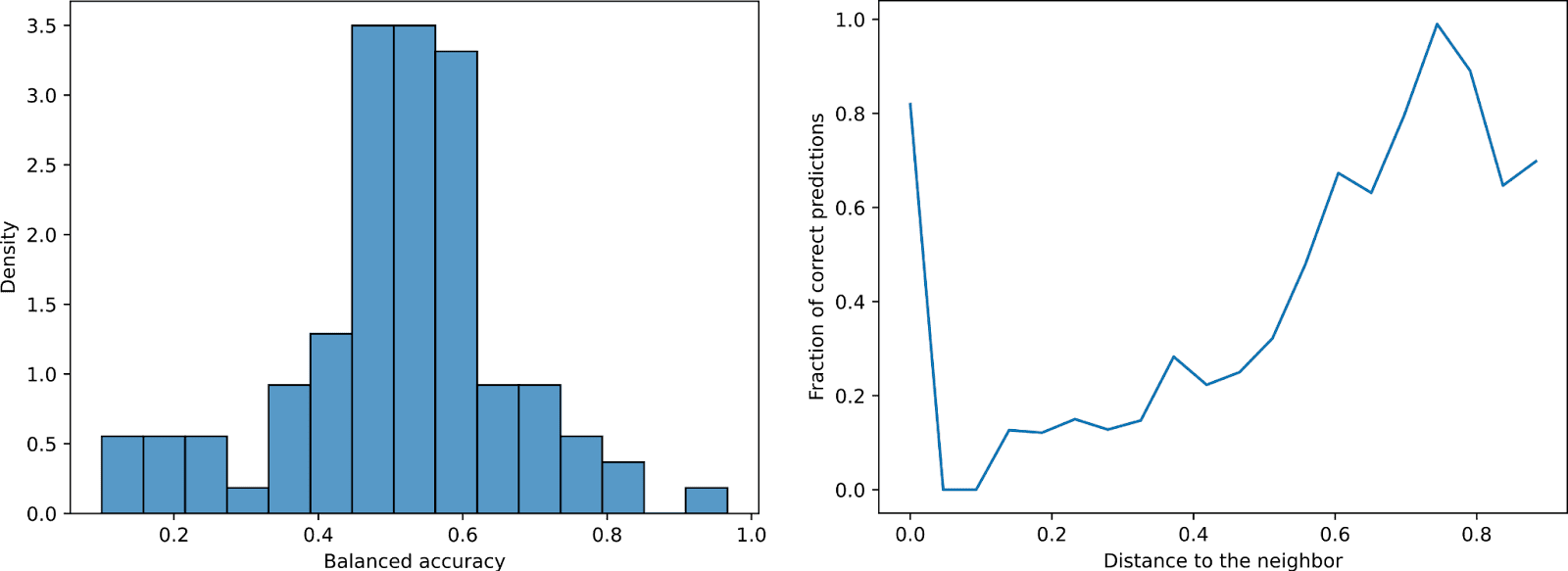 Figure S1: (Left) Balanced accuracy of detection when provided examples from neighboring features as non activating examples. The balanced accuracy drops from > 80% to ~random, indicating that the explanations generated are not specific enough to distinguish very similar contexts. (Right) As the neighbor distance increases, the scorer’s accuracy increases.