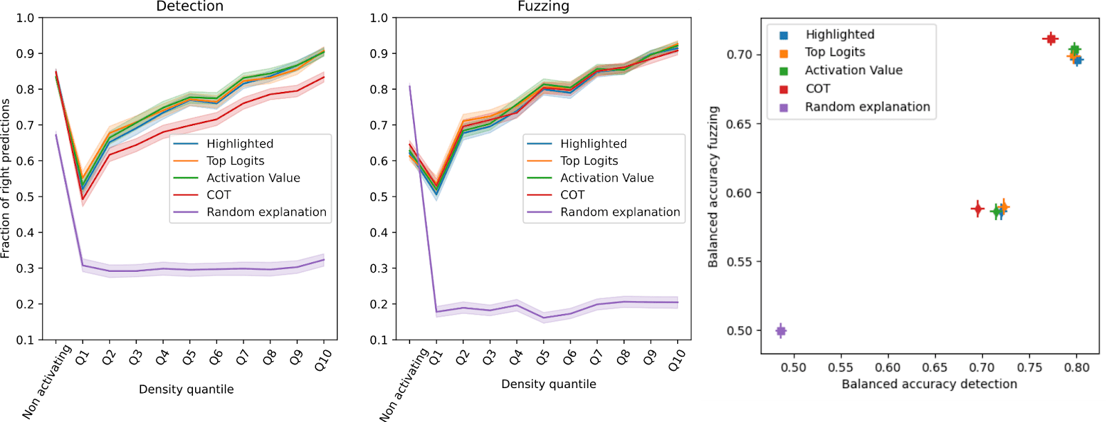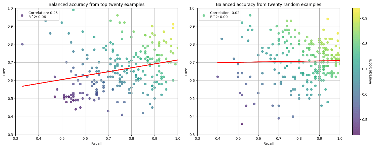 We can visualize explanation quality across the whole distribution of examples. In the figures below, we evaluate 1,000 examples with fuzzing and detection. We compare explanations generated from the whole distribution (left column) versus explanations generated from the top N examples (right column). Explanations “generalize” better when the model is presented with a wider array of examples.