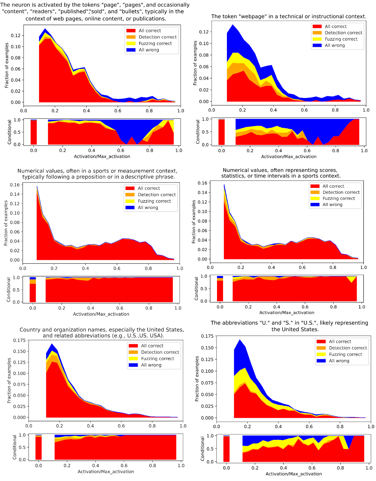 Ideally, fuzzing tests whether explanations are precise enough to separate activating tokens from irrelevant context. On manual inspection of features, we find detection and fuzzing largely agree on activating examples. However, fuzzing utterly fails to classify mislabeled examples. We hypothesize that the task may be too hard which is concerning given that fuzzed examples have tokens selected at random. Future work could measure the effect of more few-shot examples and model performance.