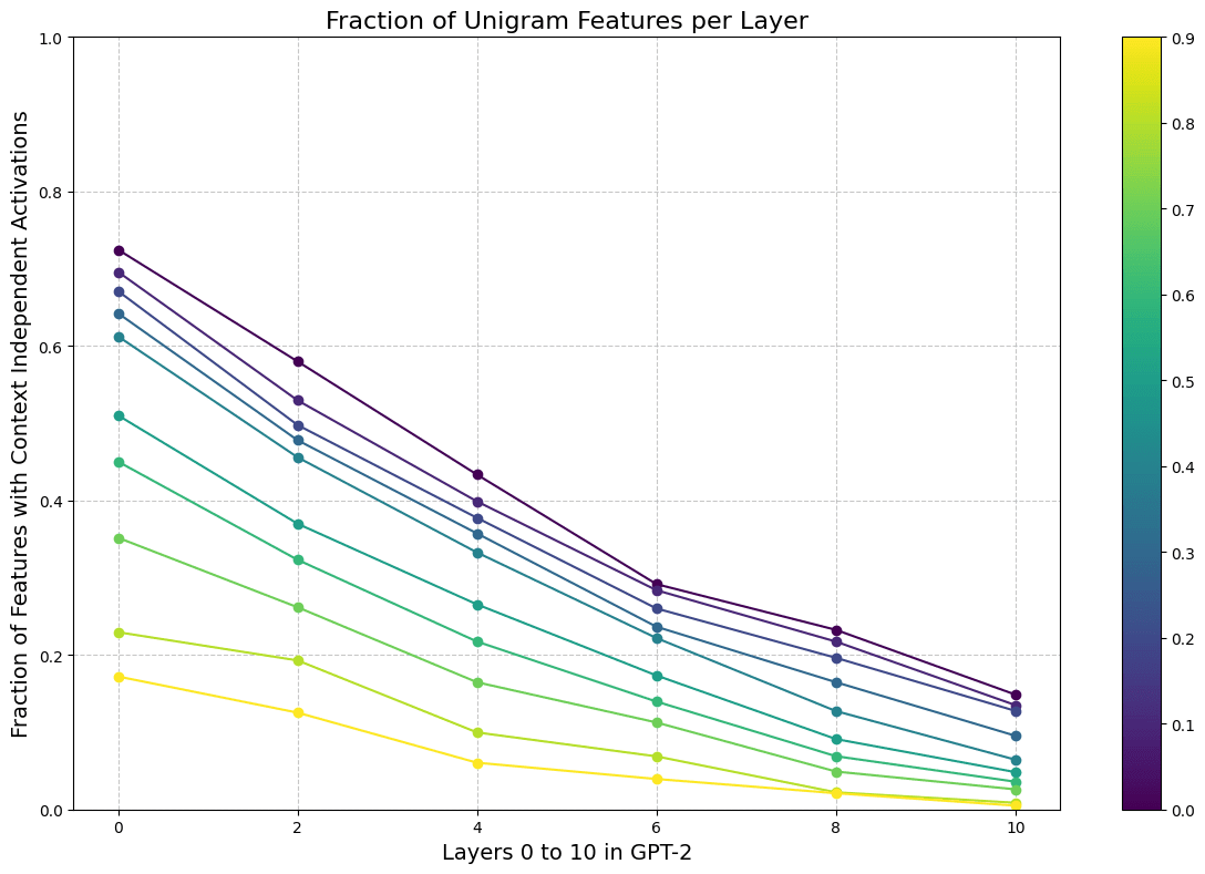 We analyze a random sample of 1k features from odd layers in GPT-2. Earlier layers have a substantial portion of context independent features.