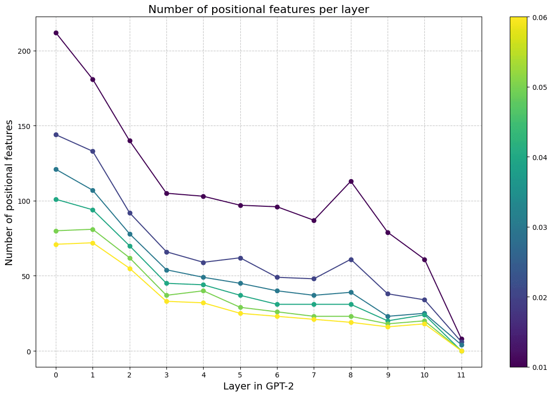 I(act,pos)=1TT∑pos=1⎡⎣f(pos)rn⋅logf(pos)rnfrn+(1−f(pos)rn)⋅log1−f(pos)rn1−frn⎤⎦.Similar to Voita et al. 2023, we find that earlier layers have a higher number of positional features, but that these features represent a small fraction (<0.1%) of all features of any given layer.