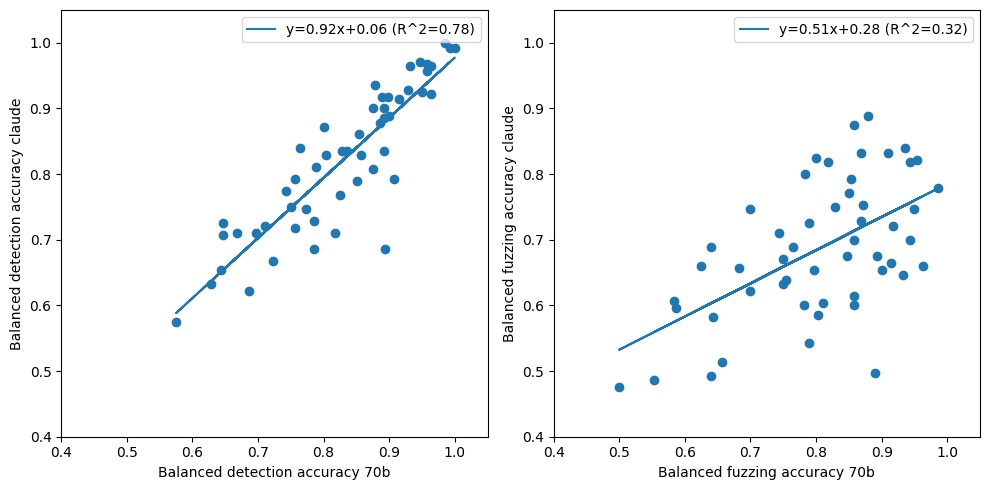 We see that both detection and fuzzing scoring are affected by the size of the evaluator model, even when given the same explanation. Still we observe that scores correlate across model size; one could estimate some calibration curve given more evaluator explanations.