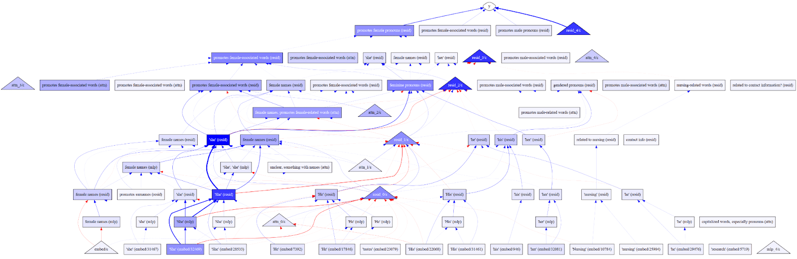 Figure 12: A sparse feature circuit for a classifier on the bias in bios task with manual labels on each node.