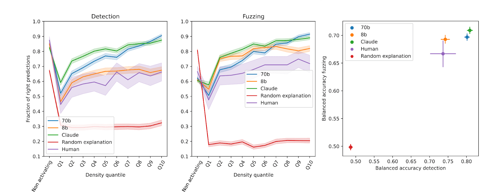 As a comparison, we show the performance of a scorer that is given a random explanation for the features. As expected, better models generate better explanations. We want to highlight that explanations given by humans are not always optimizing for high fuzzing and detection scores, and that explanations that humans find good could require different scoring metrics. We discuss this further in the text.