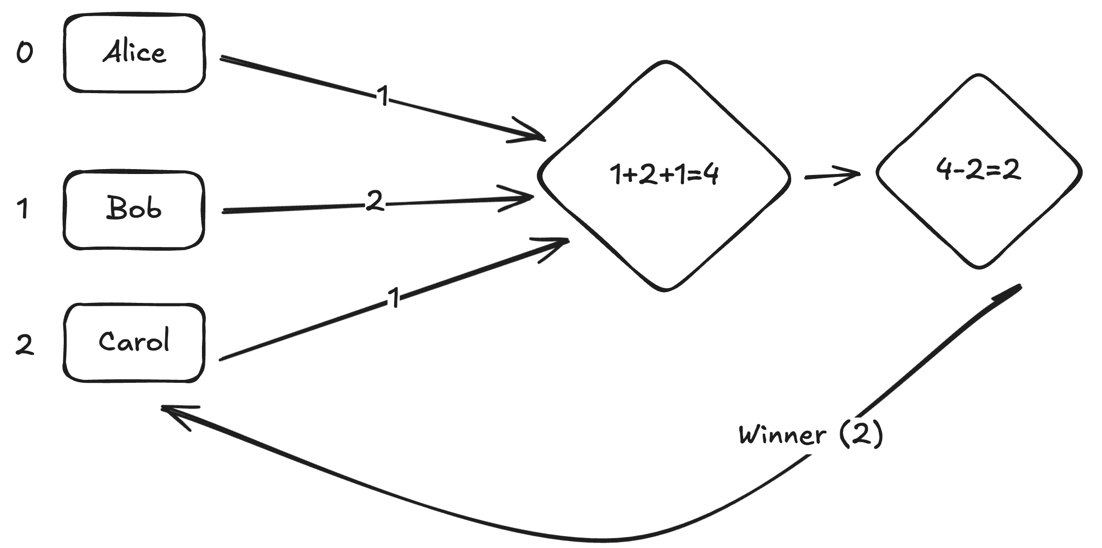 Say we have three candidates. Arbitrarily[3] assign them the numbers 0, 1, and 2. Have each candidate write a number from 0 to 2. Simultaneously reveal the numbers and then add them up. If the number is larger than 2, subtract 2 until it’s in the range 0-2. The winner is whoever’s number comes out.