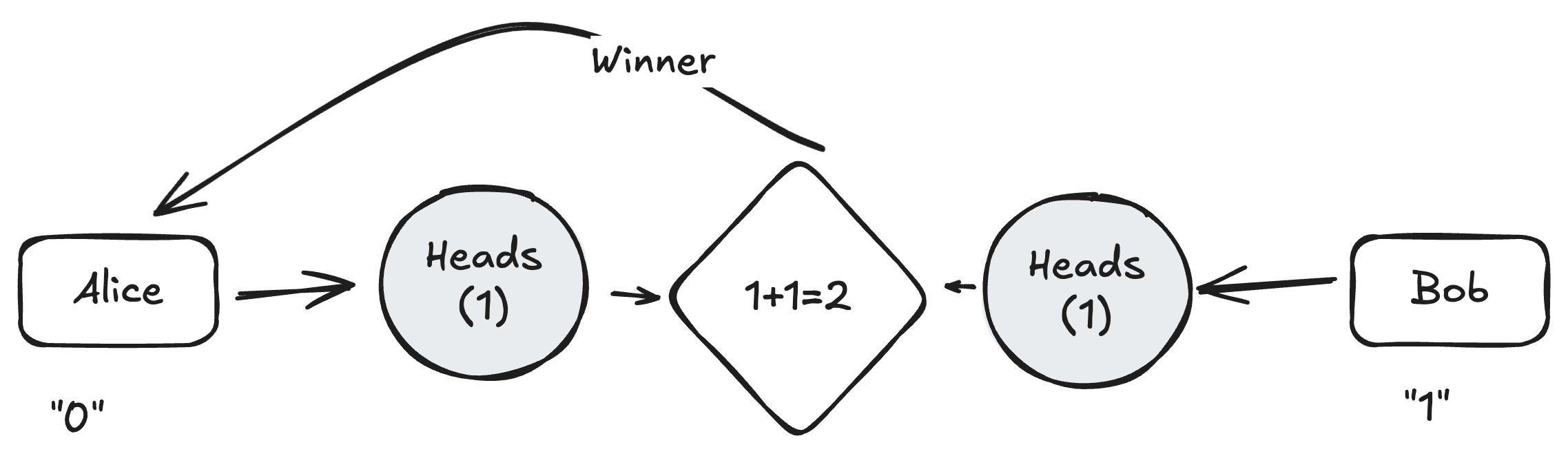 The coin algorithm is equivalent to a hash function that that takes two binary numbers (0 or 1) and returns another binary number. Say heads is 1 and tails is 0. Flip two coins, add the numbers up. If the result is even (0 or 2) then player 0 wins and if the result is odd (1) then player 1 wins.