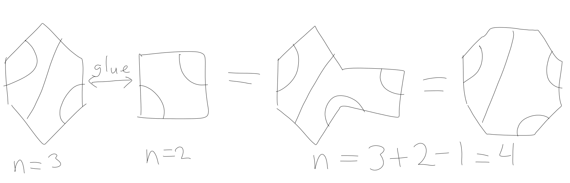 There are pairs of sizes we can glue together (if you're okay with -sided polygons), but I haven't made much progress in this direction. All I've found is gluing two polygons together decreases the number of loops by zero, one or two.