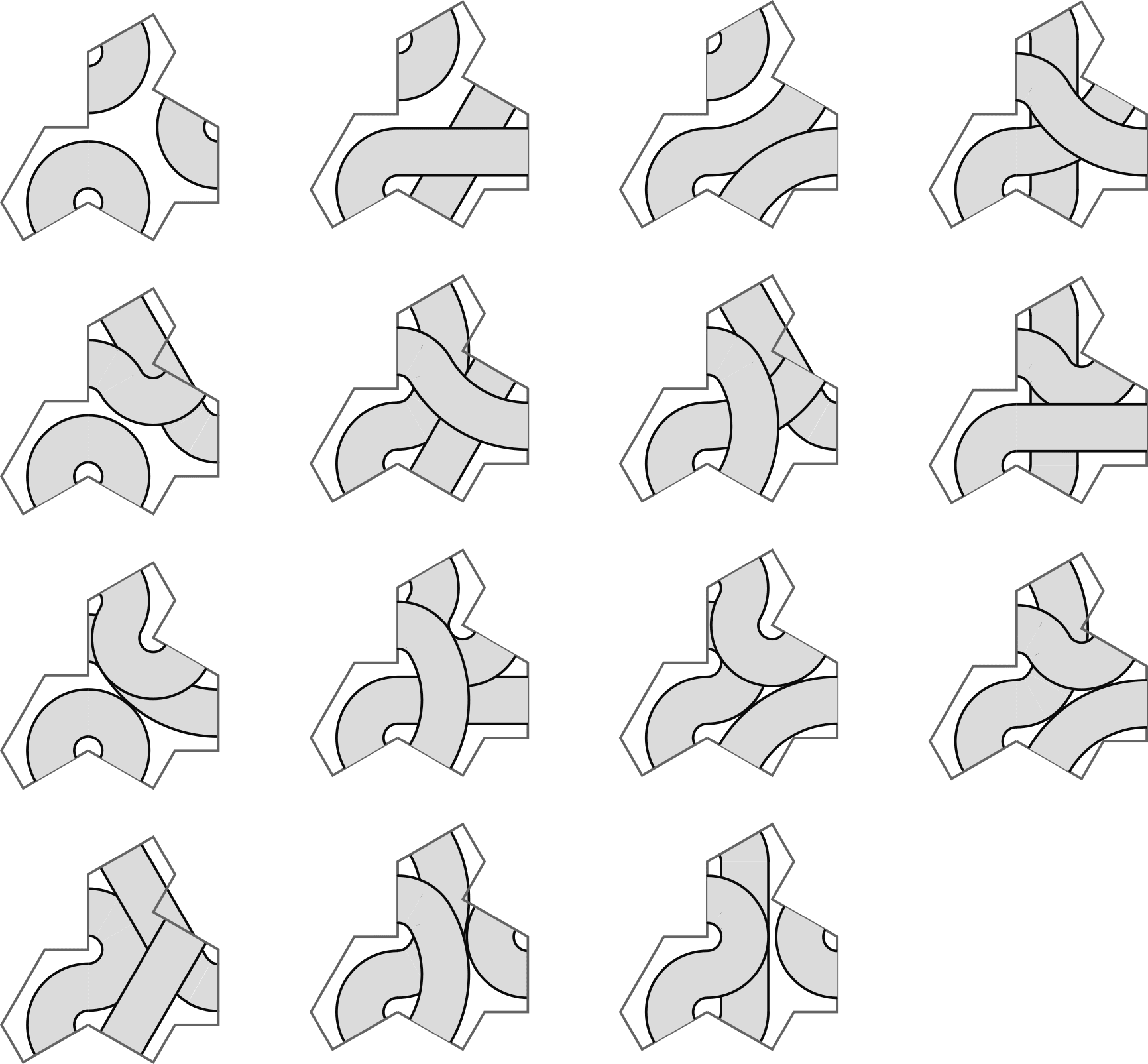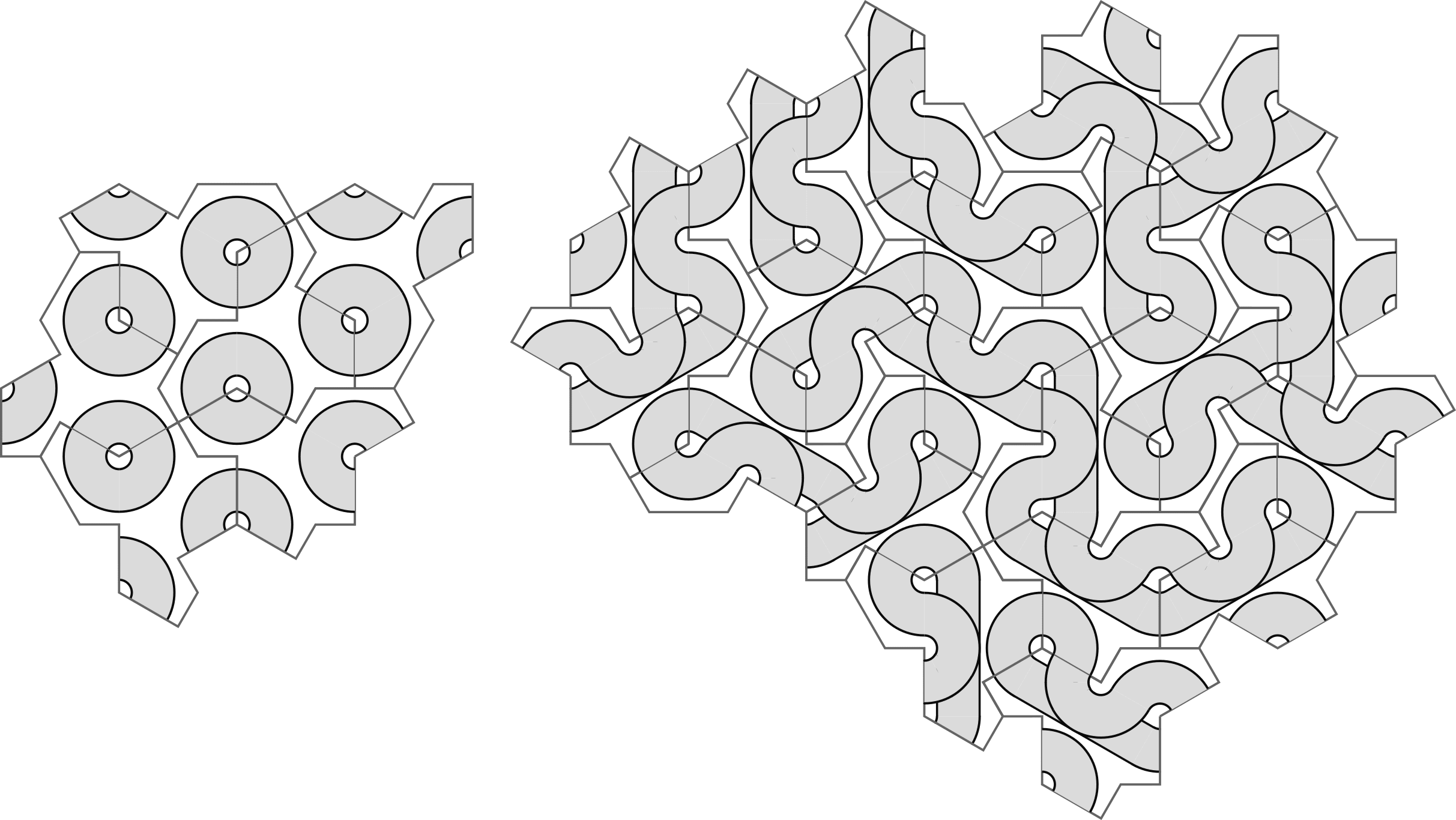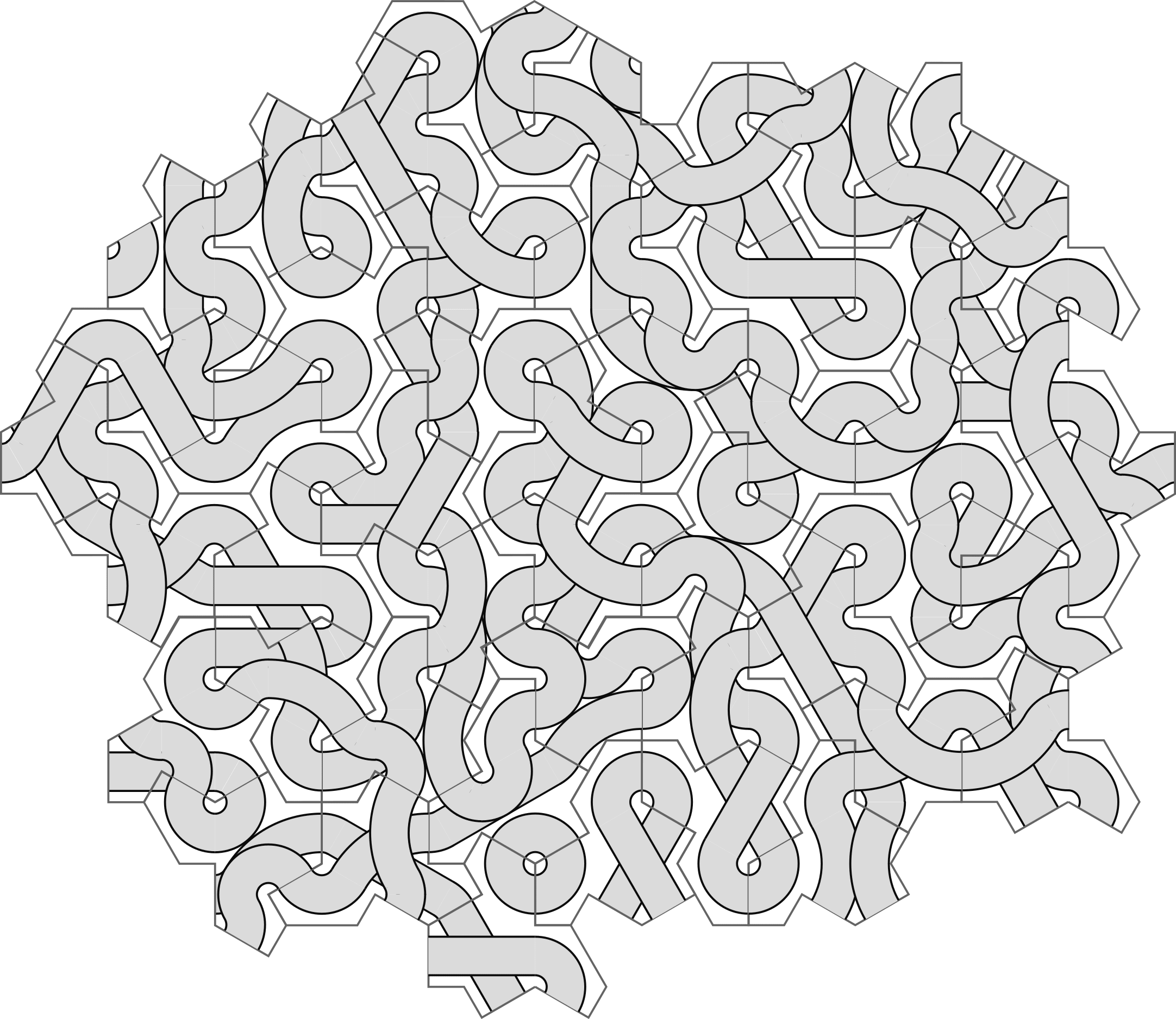 The aperiodic tiling from the paper cannot be put onto a hexagonal grid, and some of the tiles are flipped vertically, so you need every edge to have an entry/exit to make a Celtic knot out of it. Also, I would recommend using rather than so the arcs turn out pretty: