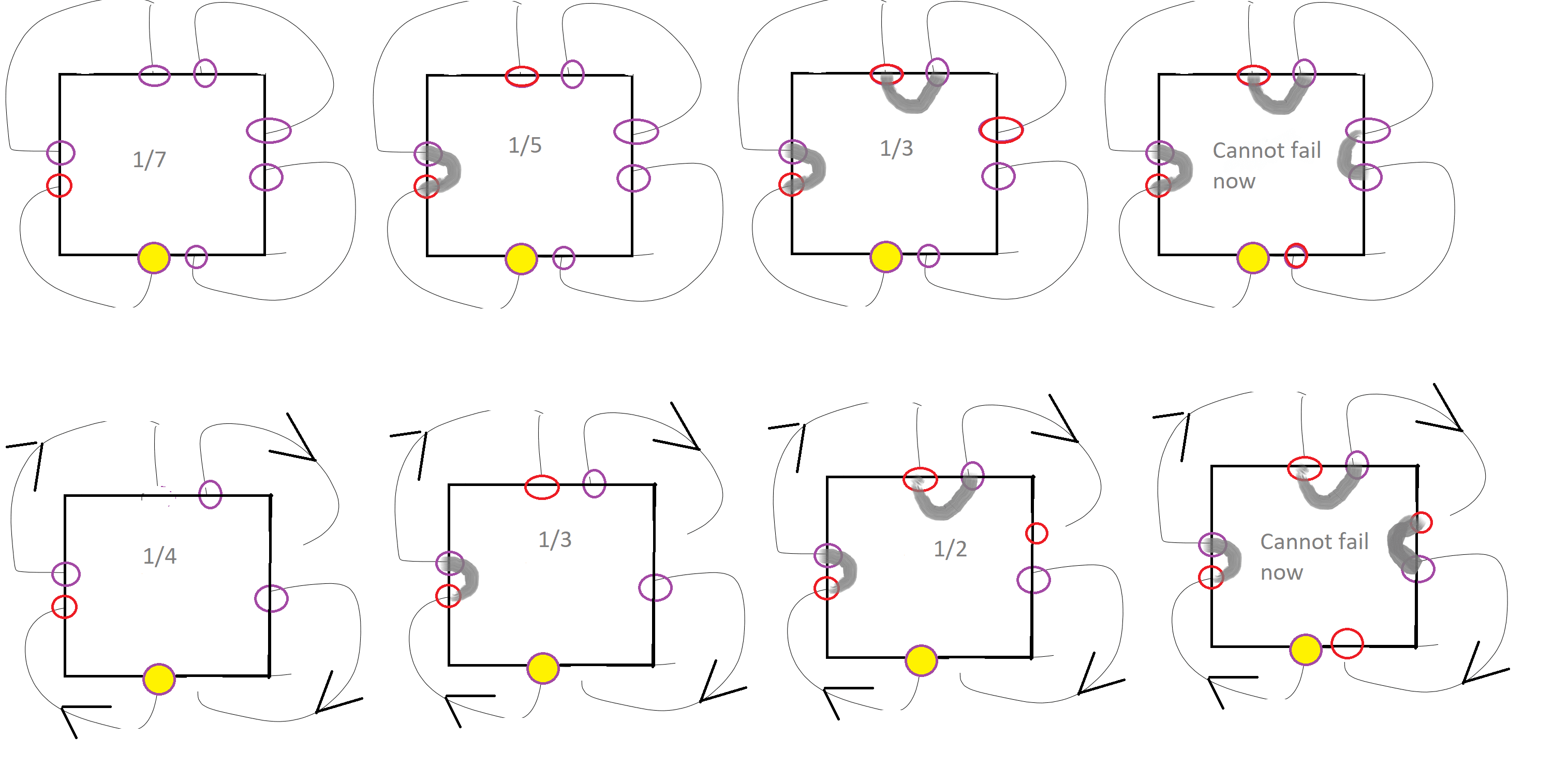 In the simplest case is one tile. The orange lines are the "edging rule". Pick one black point and connect it to another at random. This has a 1/13 chance of immediately creating a closed loop, meaning more than one loop total. Assuming it doesn't do that, the next connection we make has 1/11 chance of failure. The one after 1/9. Etc.