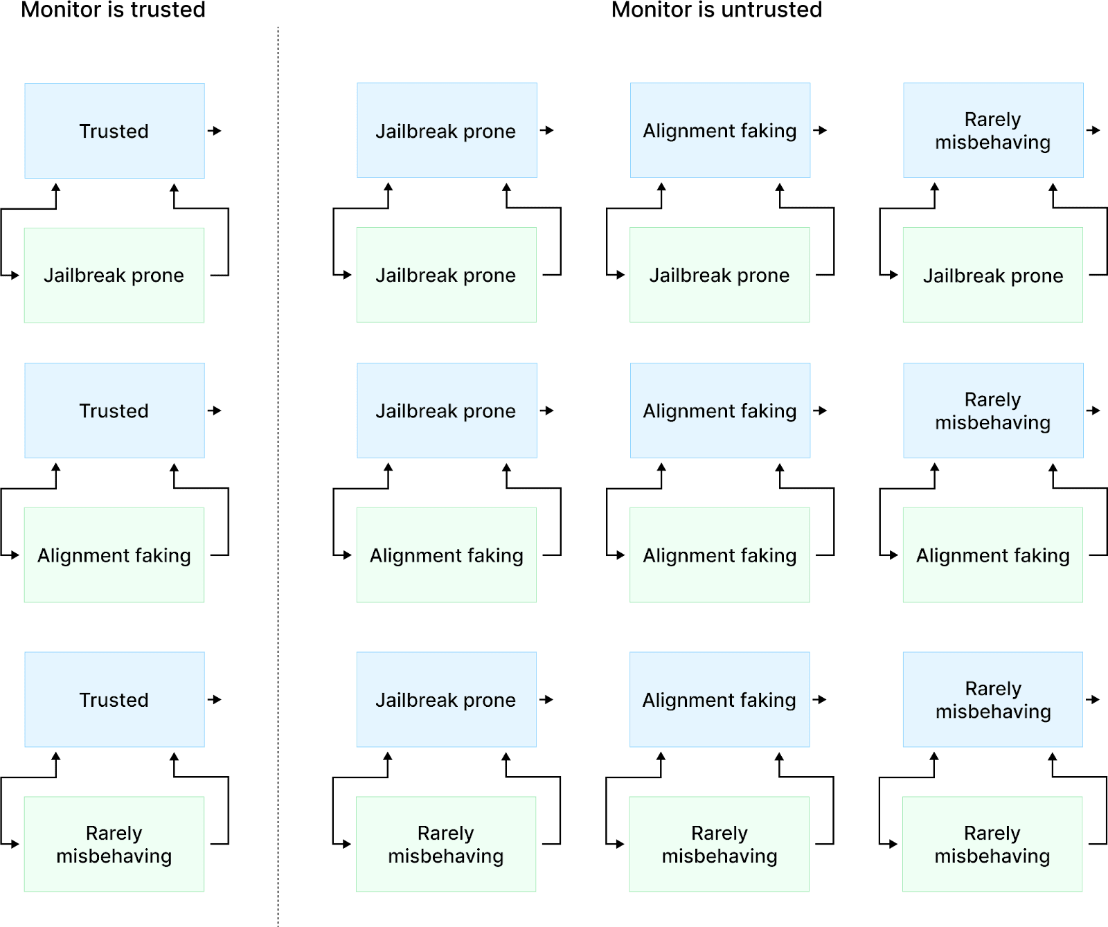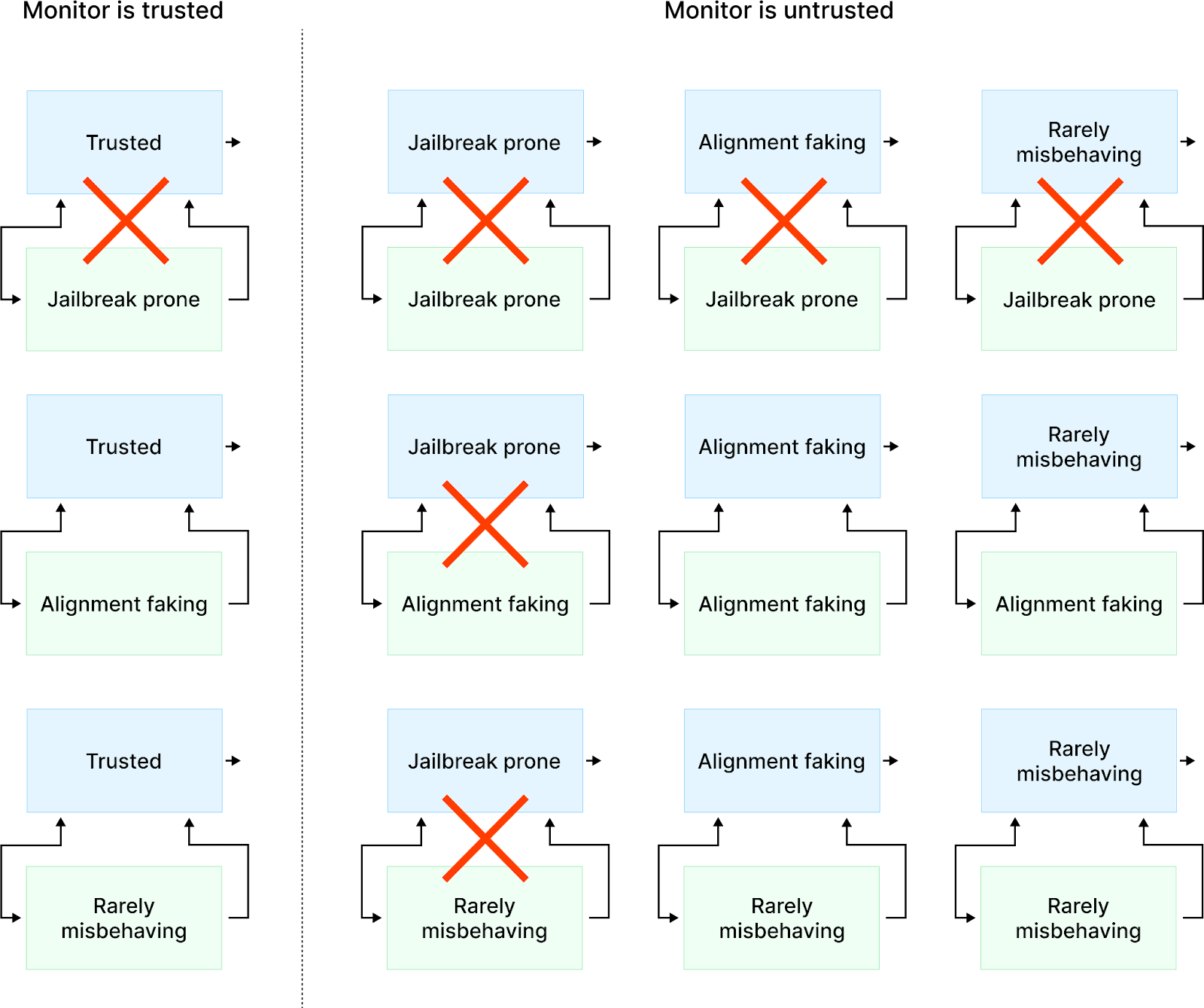 I will discuss 12 different combinations of potentially unsafe policies. 9 of these combinations are pairings where both the monitor and policy are untrusted. 3 of these combinations represent situations where only the policy is untrusted (figure 6).