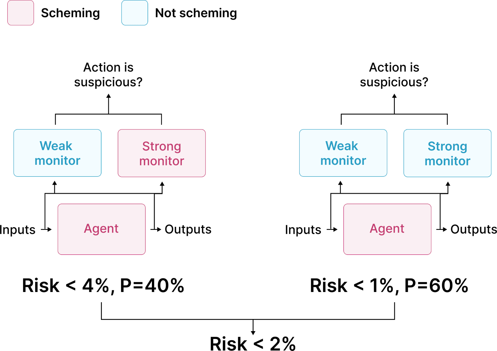 Figure 1. Traditional control evaluations assess risk under different assumptions about which models are scheming.