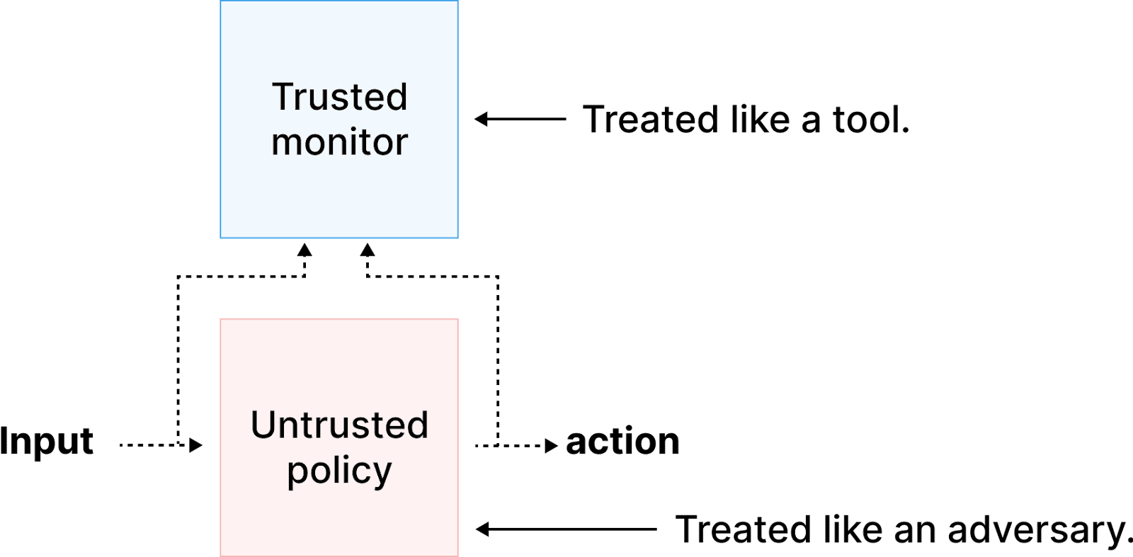 These example arguments imply that the monitor can be treated as ‘trusted,’ while the policy must be treated as ‘untrusted.’ Thus, the example arguments above imply that the developer only needs to assess the worst-case behavior of the untrusted policy and not the monitor. The next section describes how developers might assess whether a given untrusted model is capable of subverting control measures to cause bad outcomes.