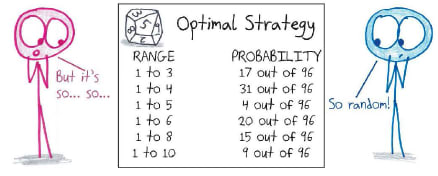 For exactly this reason, I'd be a fool to tell you what range I'm going to pick. Instead, I'm going to randomize my answers. You'd be wise to do the same. With game theory, we can calculate the optimal probabilities: