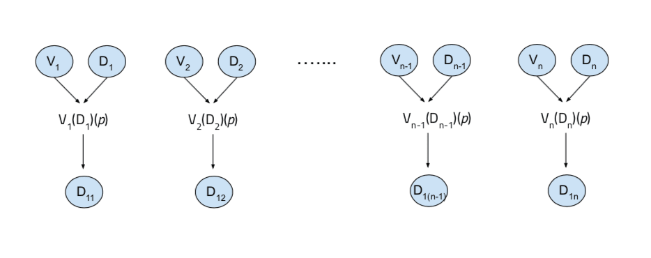 For each of these distribution-value function pairs, the value function is applied to the distribution (so V1 is applied to D1, V2 is applied to D2, and so on) by taking a number p as an input to obtain the top p% of QASs from the distribution, as ranked by that value function. These top p% of quantilizers then become a new, second-level distribution that we eventually want to quantilize again (D11, … , D1n, respectively, in the illustration below)[26]: