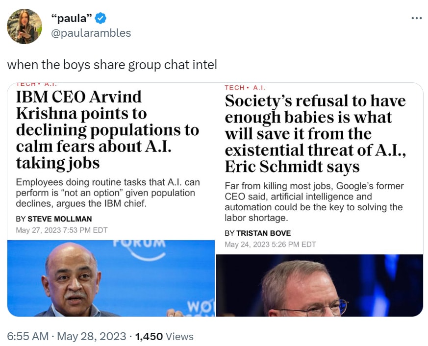 Declining aging populations are indeed a good argument for developing, deploying and utilizing incremental AI systems, as we have more need to gain productivity and save labor, and less concern about potential unemployment. Krishna takes it too far to presume that not having AI automate more work is ‘not an option’ but certainly this makes that option worse. It could even be a good argument for developing dangerous AI if you think that the alternative is catastrophic.