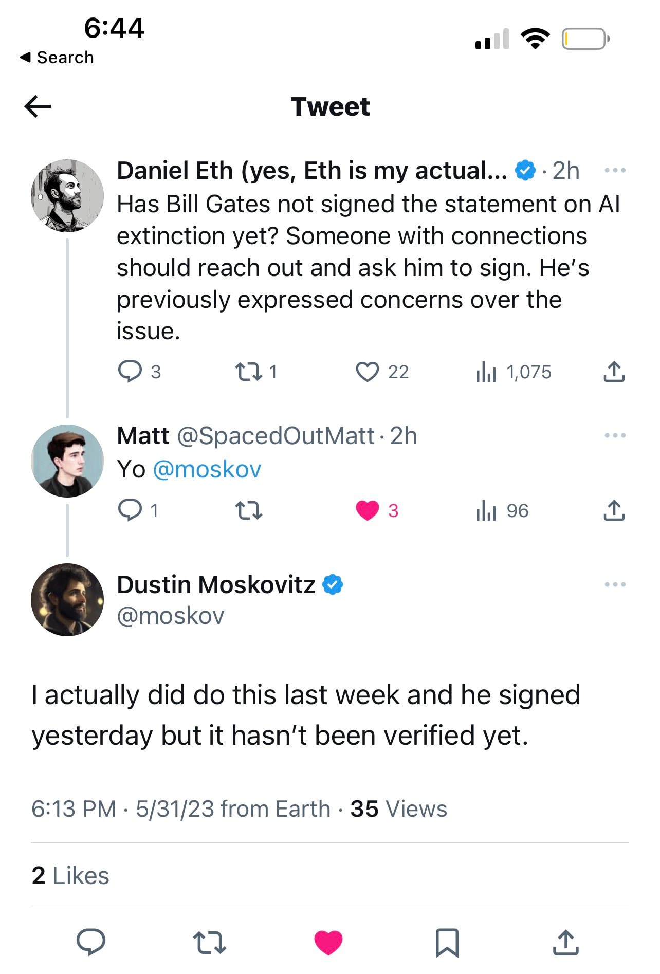 Here’s Jan Brauner, who helped round up signatures, explaining he’s not looking to ‘create a moat for teach giants’ or ‘profit from fearmongering’ or ‘divert attention from present harms’ and so on.