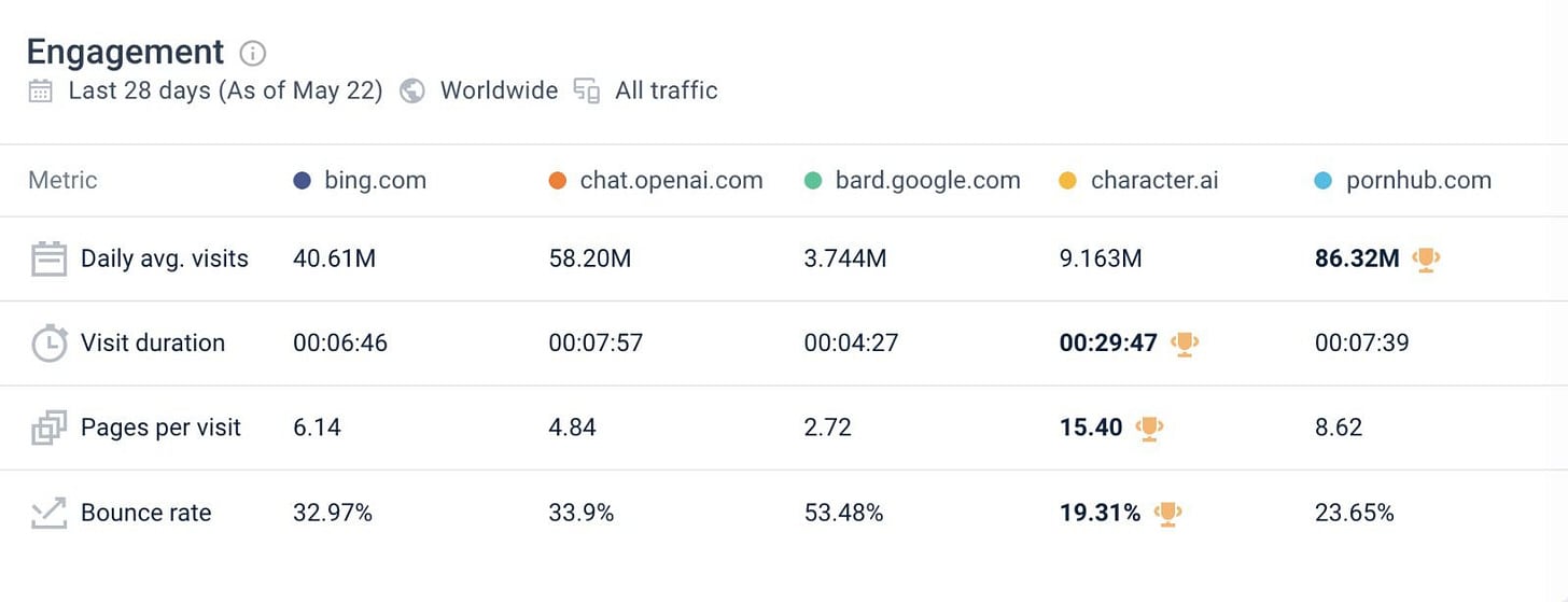 I almost never consider character.ai, yet total time spent there is similar to Bing or ChatGPT. People really love the product, that visit duration is off the charts. Whereas this is total failure for Bard if they can’t step up their game.