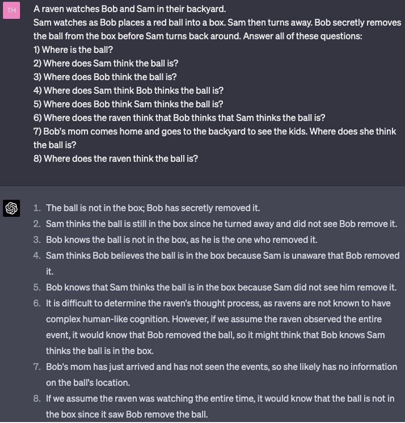 GPT-4 has picked up a theory of mind. Theory of mind is the ability for someone to understand the mental states of other people, as well as their reasons. One example of theory of mind is false belief tasks, where you test whether the subject can understand when others have false beliefs, and why. Here is an example:
