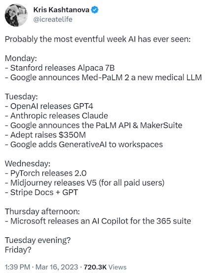 If you’ve been following new developments since ChatGPT was released, it has felt like the future has been accelerating toward us faster and faster. A snapshot from a moment in time in March: