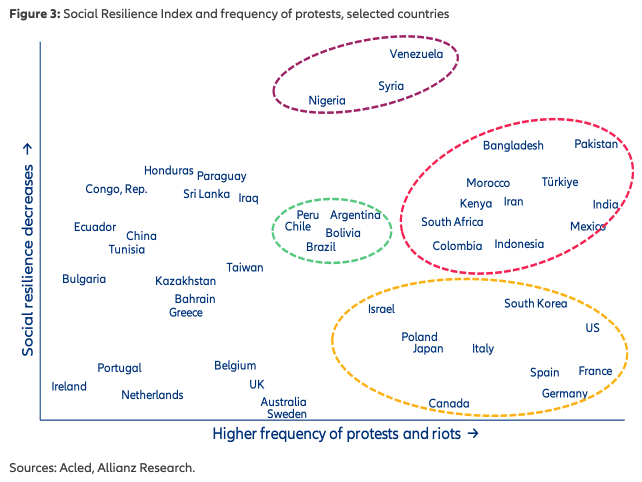 Recent data from Allianz Research captures this dynamic through their Social Resilience Index, which maps countries according to the frequency of protests and social resilience decreases (see Figure 2).