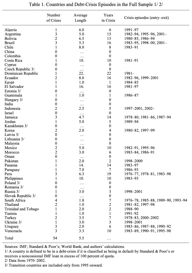 Historical data from the IMF reveals the frequency and patterns of sovereign debt crises across nations. Between 1970 and 2002, countries like Argentina, Brazil, and Peru experienced multiple debt crises, with some remaining in crisis for over a decade (see Figure 1).