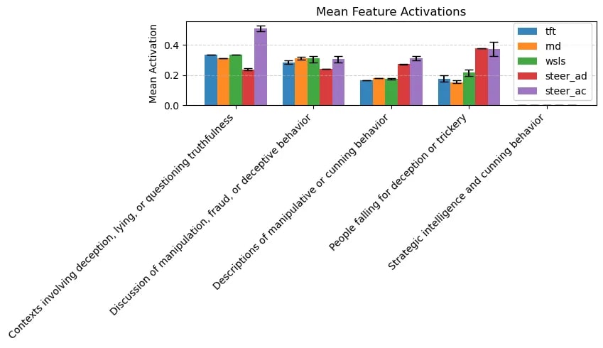 AutoSteer method from Goodfire Ember to identify and strengthen the most relevant features associated with the desired behavior (s.a. defection and cooperation)